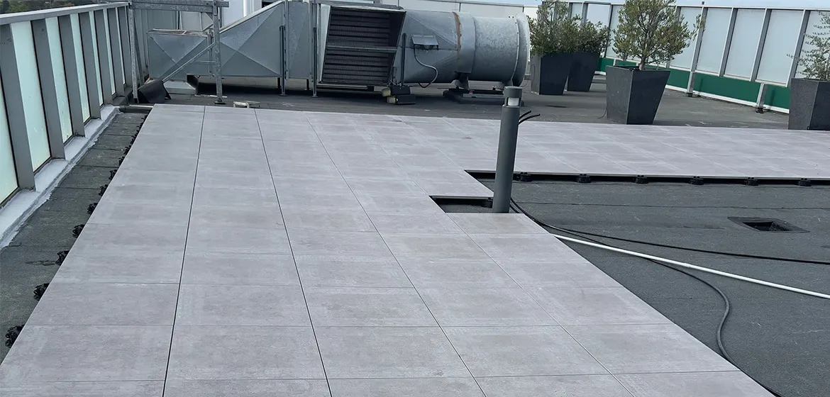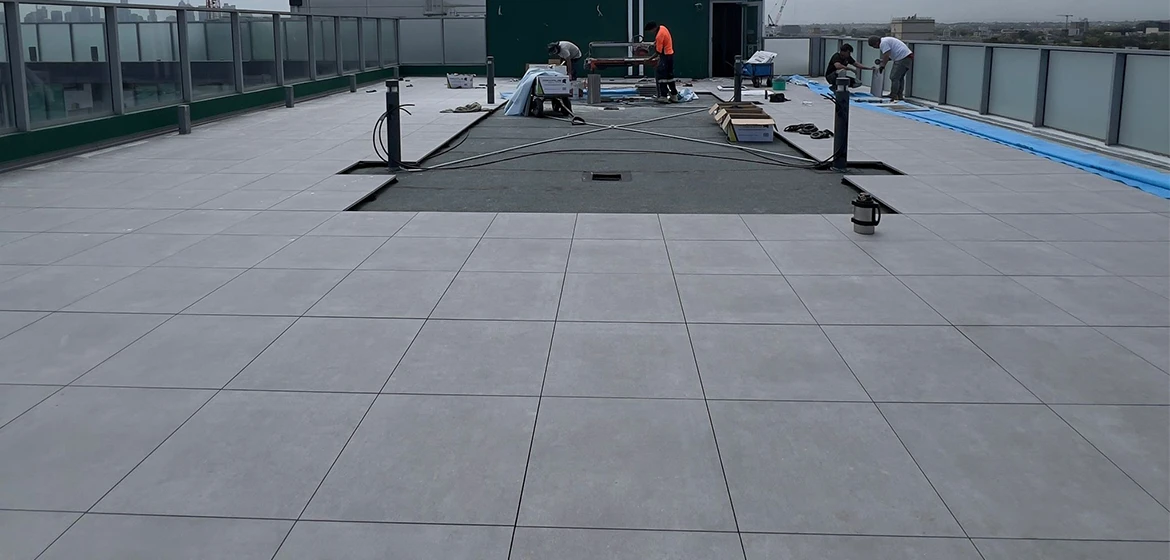 For the paver installation, precision was key. Using a pedestal system, our five-person team installed the pavers over three days, ensuring level surfaces, clean lines, and easy future access for maintenance.
